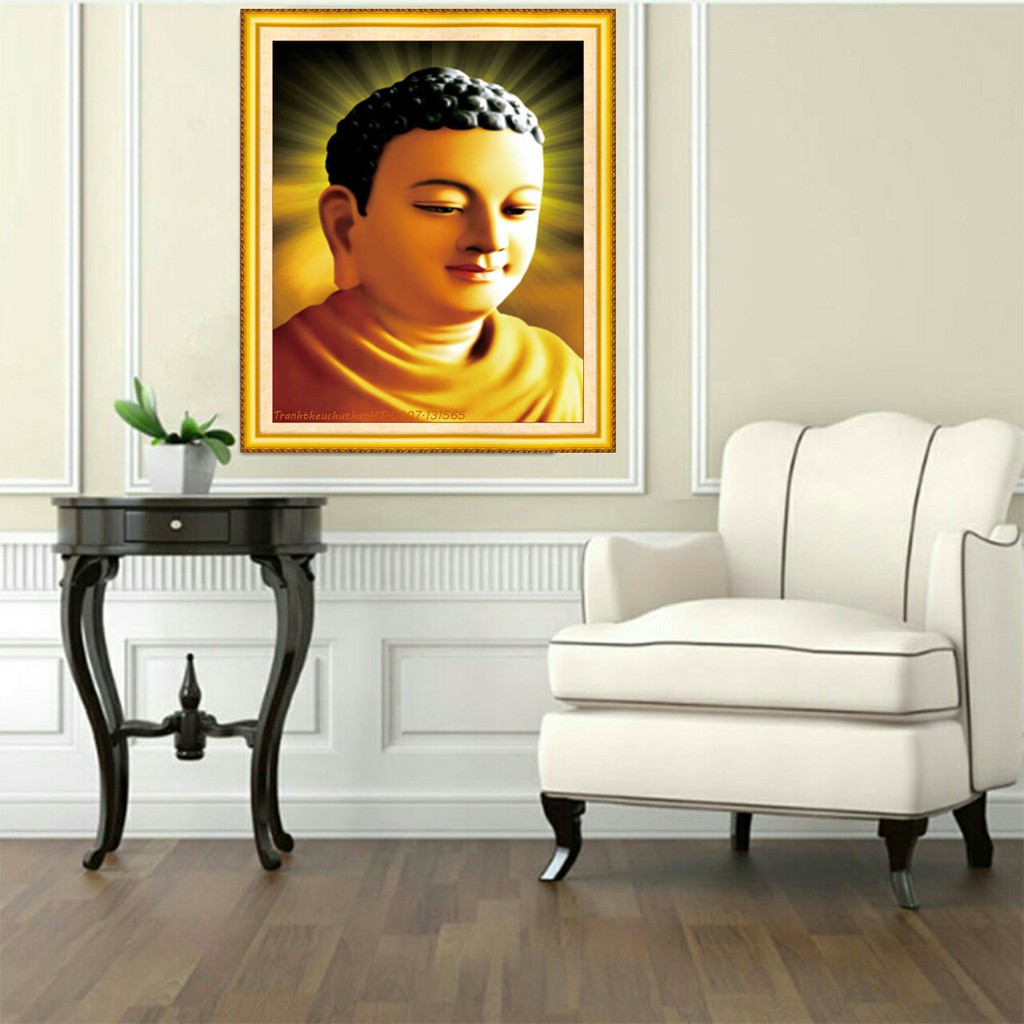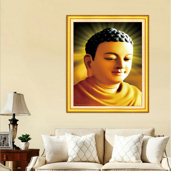 Mẫu này rất đẹp, thêu các chi tiết trên nền vải 3D in sẵn, màu sắc tươi sáng, sang trọng. Gương mặt phật in 3D rõ đẹp, kích thước vừa phải có thể làm tranh thờ.