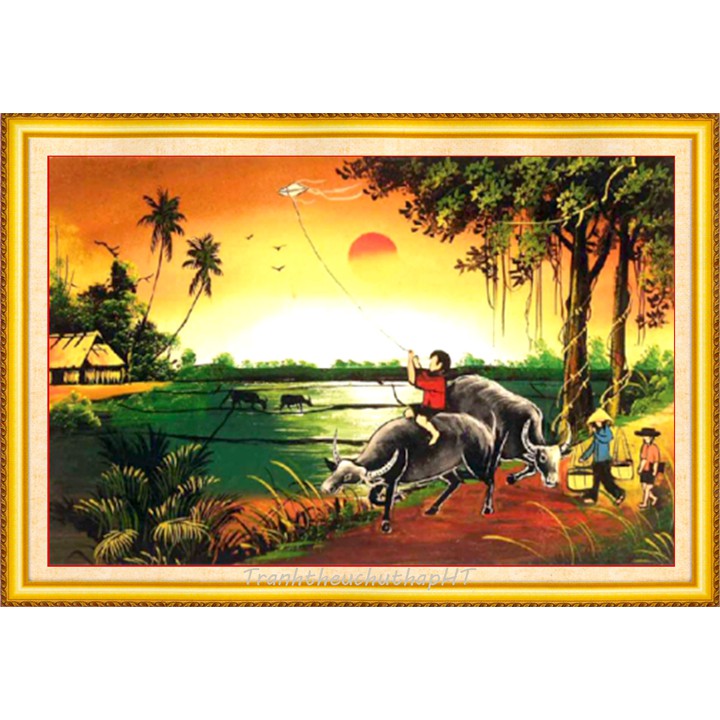 Mẫu này rất đẹp, thêu cây, ngôi nhà, con trâu, mục đồng… thêu các chi tiết trên nền vải 3D in sắc nét, rõ, đẹp (phần thêu như hình đính kèm), màu sắc tươi sáng, sang trọng.