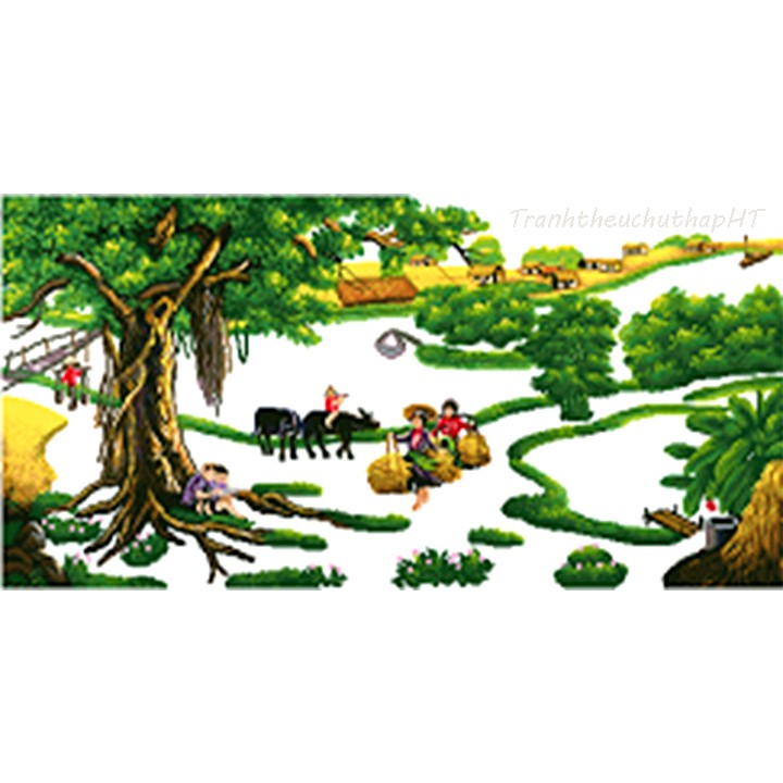 Mẫu này rất đẹp, thêu cây, ngôi nhà, con trâu, mục đồng… thêu các chi tiết trên nền vải 3D in sắc nét, rõ, đẹp (phần thêu như hình đính kèm), màu sắc tươi sáng, sang trọng.
