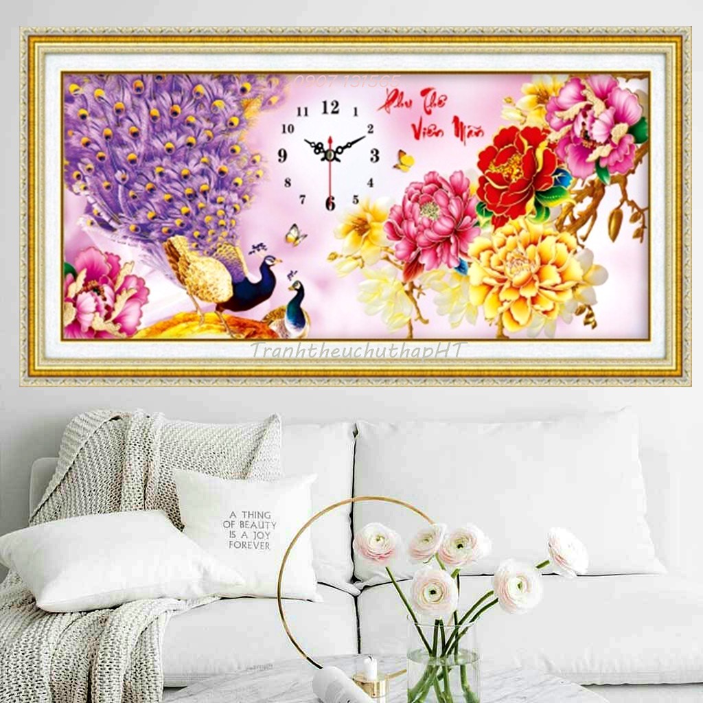 Mẫu này rất đẹp, thêu toàn bộ chim công và hoa… trên nền vải 3D in sắc nét, rõ, đẹp, màu sắc tươi sáng, sang trọng (phần thêm như hình đính kèm).