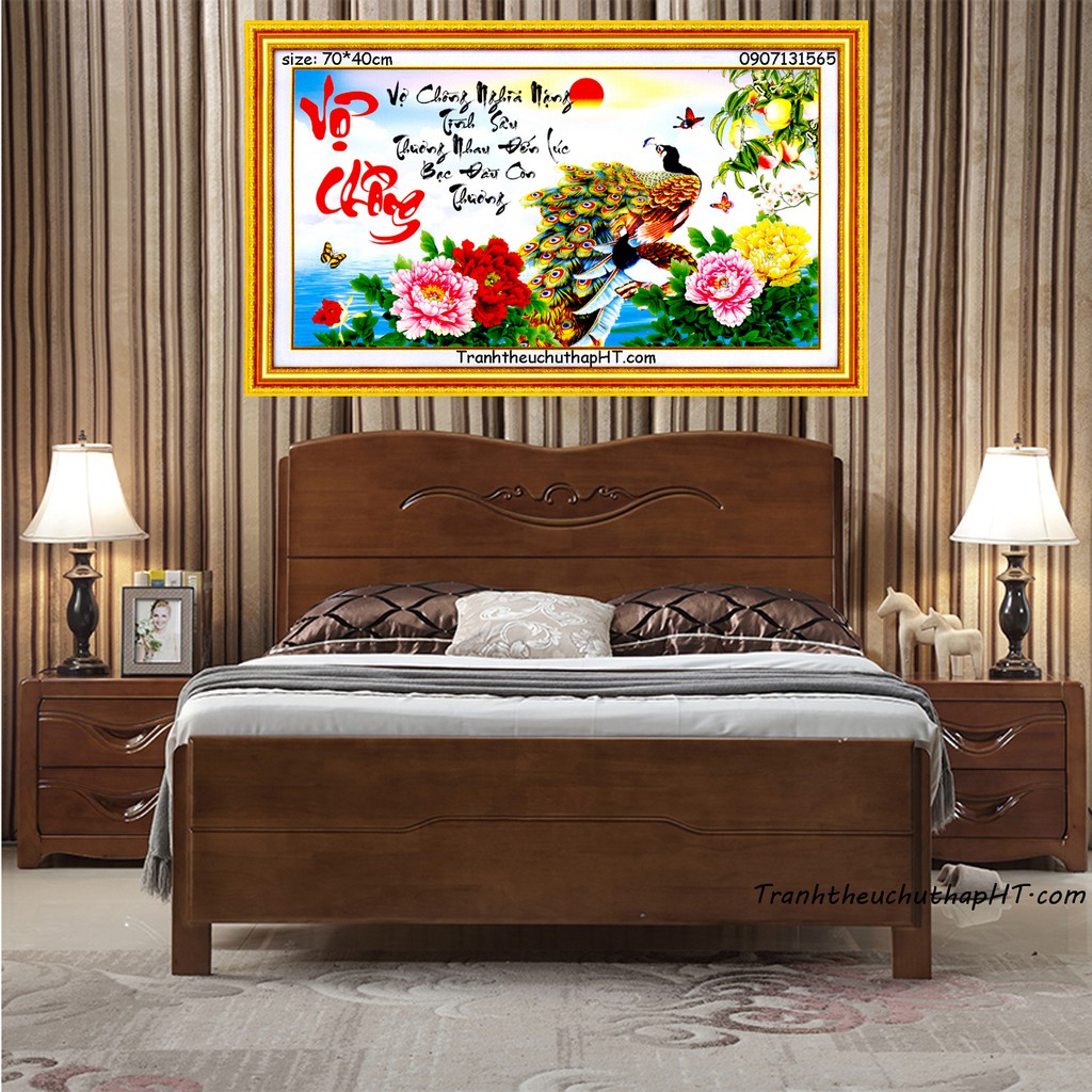 Tranh thêu đôi công hoa mẫu đơn kết hợp thư pháp vợ chồng. Mẫu này rất đẹp, thêu khá nhiều, thêu đôi chim công, hoa mẫu đơn, lá, nhánh đào và có gắn những hạt đá lấp lánh làm mắt đuôi công kết hợp với phần thêu, giúp bức tranh thêm sống động.