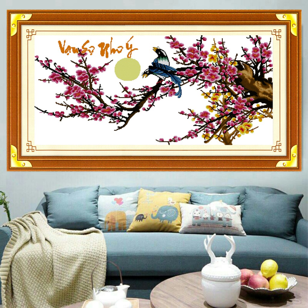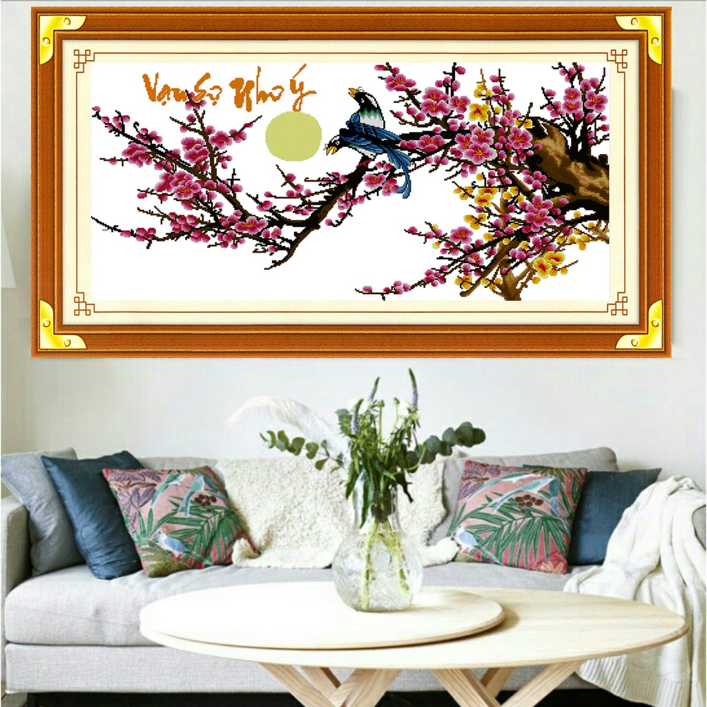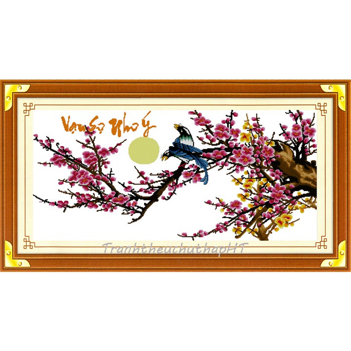 Tranh thêu chữ thập Vạn sự như ý H006 - tự thêuÝ nghĩa: Tranh nghệ thuật, trường phái phương đông, hoa mai hoa đào đón xuân, vạn sự như ý.