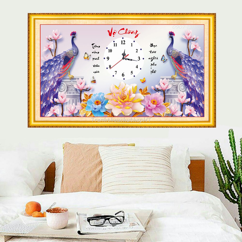 Mẫu này rất đẹp, thêu chim công, cây lá, hoa và chữ trên nền vải 3D in sắc nét, rõ, đẹp, màu sắc tươi sáng, sang trọng (phần thêm như hình đính kèm).