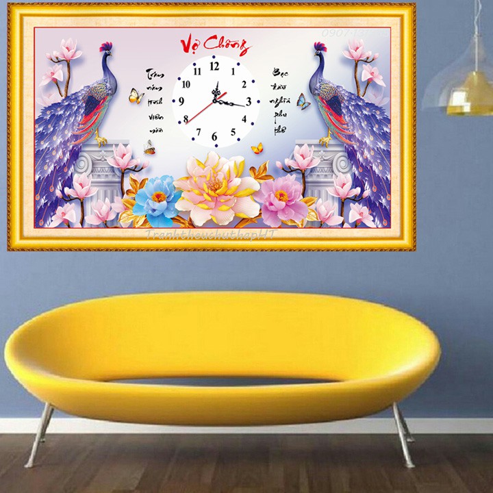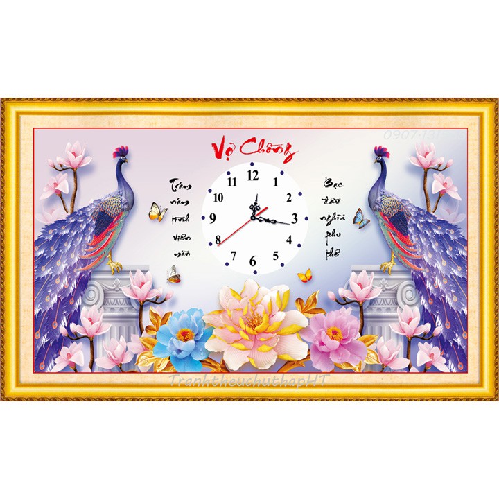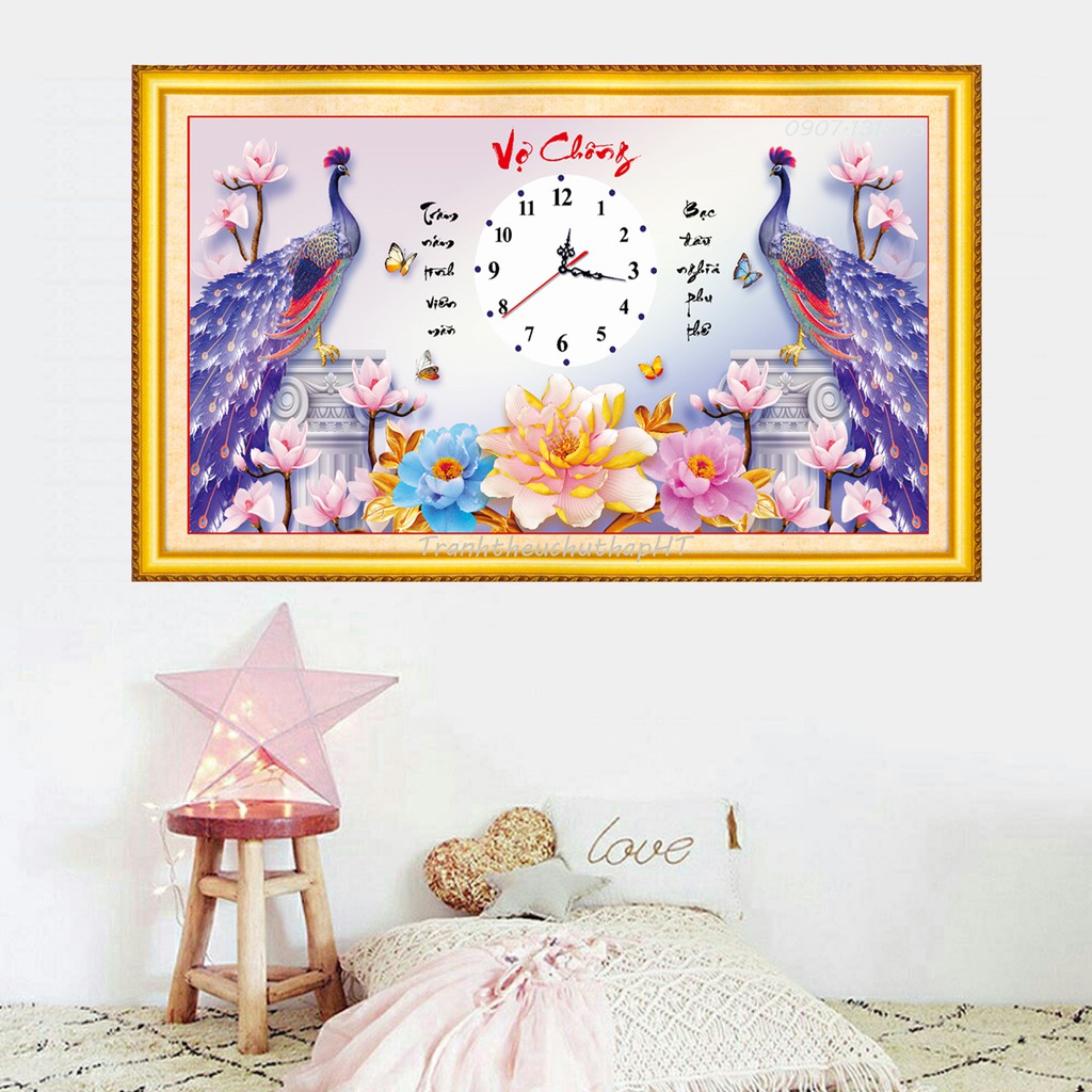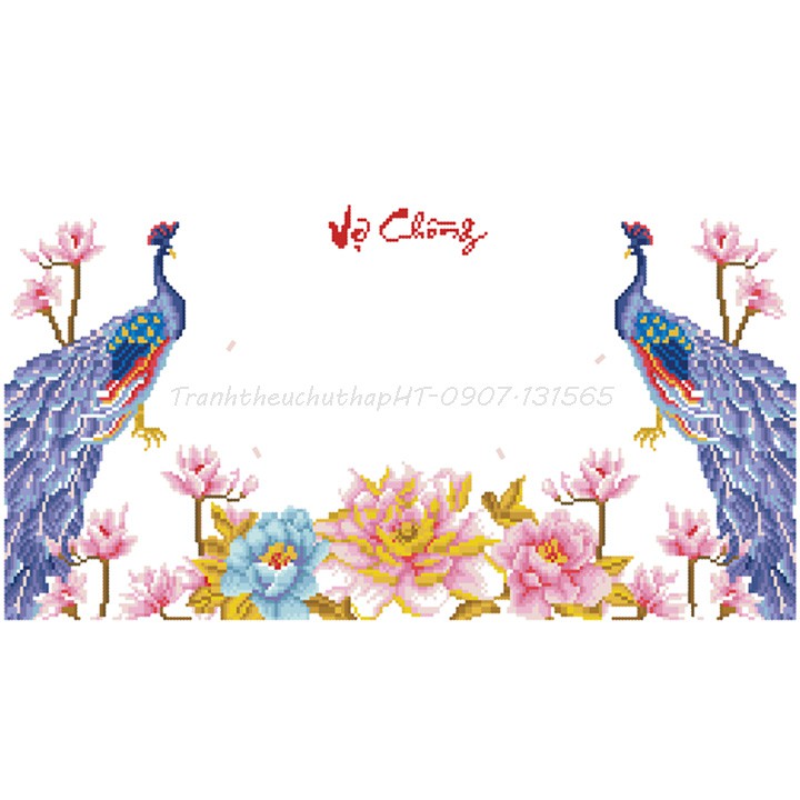 Mẫu này rất đẹp, thêu chim công, cây lá, hoa và chữ trên nền vải 3D in sắc nét, rõ, đẹp, màu sắc tươi sáng, sang trọng (phần thêm như hình đính kèm).