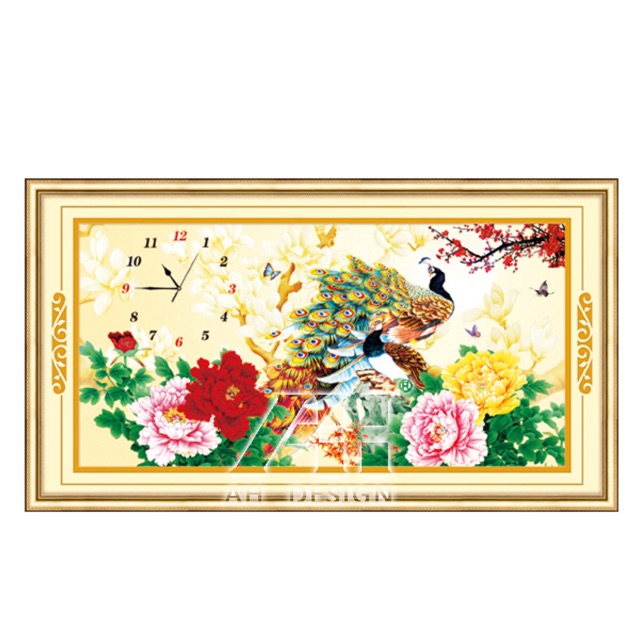 Tranh 3D thêu các chi tiết sau: đồng hồ, tre, mẫu đơn, lá, công, chữ