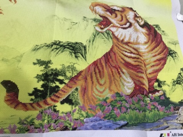 Tranh 3D thêu các chi tiết sau:hổ, chữ, đại bàng, cây tùng, hoa, đá