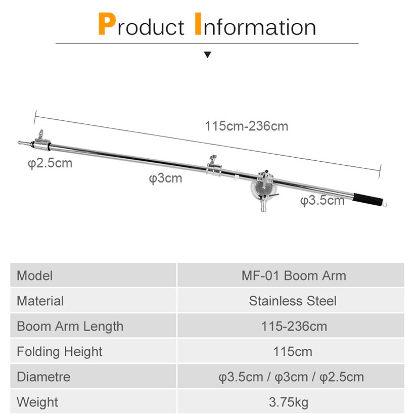 Tay boom đèn Inox MK MF-01 236cm với thiết kế chắc chắn được làm từ chất liệu Inox, có khả năng chịu tải cao từ 15-20kg có thể treo hầu hết tất cả các loại đèn studio. Tay boom MK MF-01 có chiều dài tối thiểu là 115cm và tối đa là 236cm với đường kính ống lần lượt là 35/30/25mm.THÔNG SỐ KỸ THUẬT: