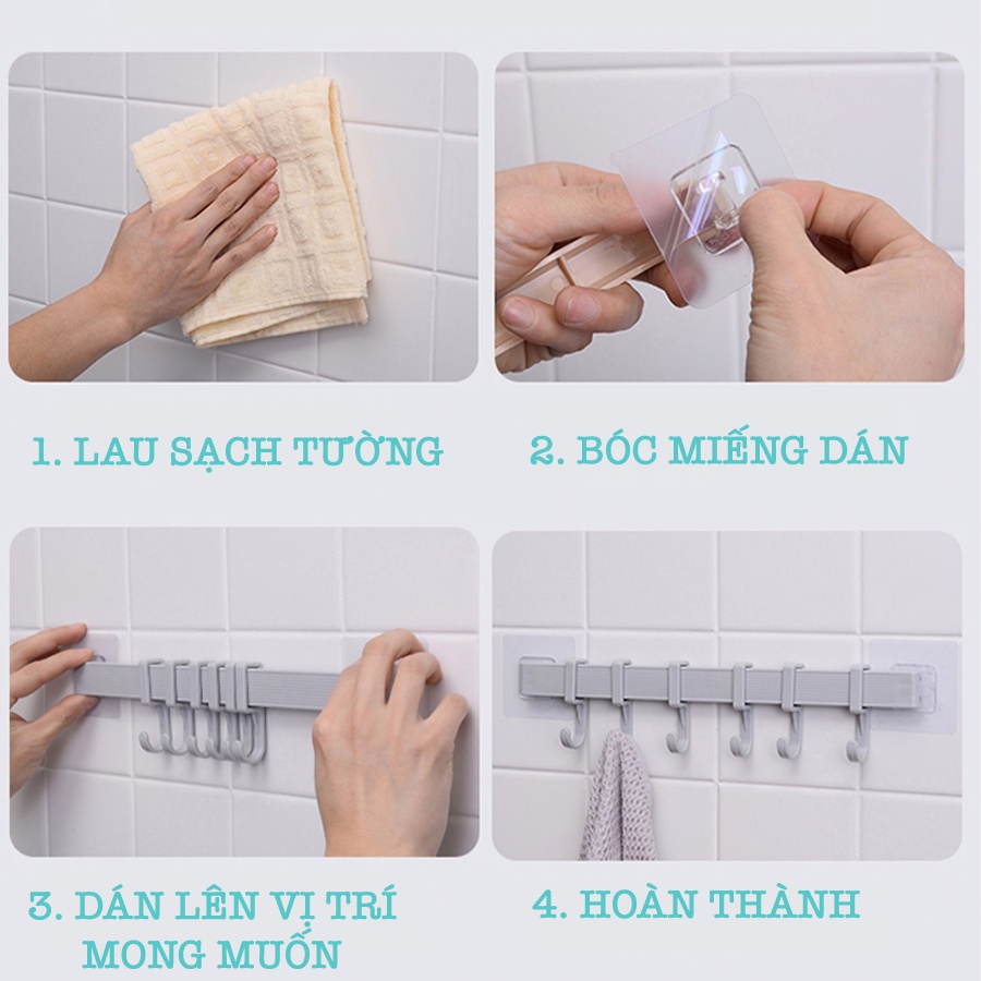 - Móc treo là 1 Thanh dài gồm 6 móc treo đa năng treo được nhiều vật dụng cùng lúc, tái sử dụng dễ dàng bằng cách rửa và lau khô.