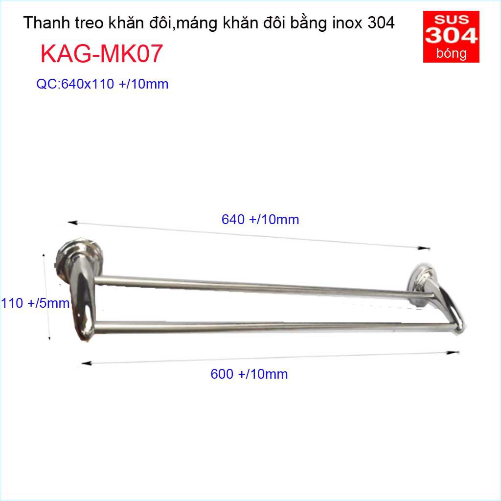 Thanh treo khăn đôi nhà tắm, giá treo đôi khăn Inox 304, máng khăn đôi inox KAG-MK07Chất liệu: Thanh treo khăn đôi nhà tắm, giá treo đôi khăn Inox, máng khăn đôi inox KAG-MK07 sản xuất bởi inox SUS304 cao cấp, siêu bóng, không rỉ séc, bền bỉ với thời gian, thiết kế hiện đại