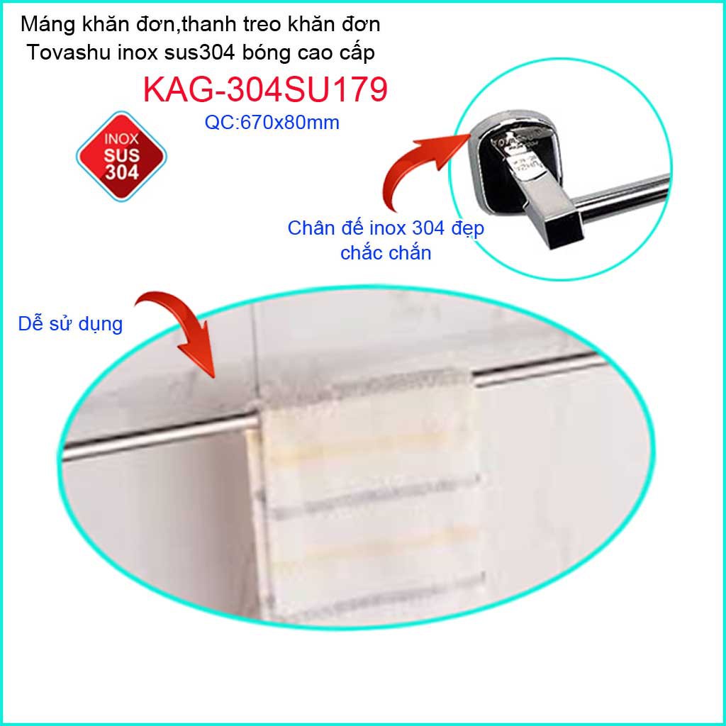 Giới thiệu Thanh treo khăn tắm Tovashu KAG-304SU179, Giá treo khăn phòng tắm Inox hộp cao cấp SUS304 Nhật Bản