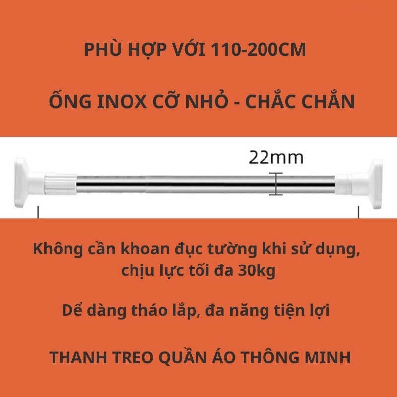 Thanh Treo Quần Áo, Thanh Treo Rèm Không Cần Khoan TườngThanh treo rèm không cần khoan tường, thanh treo quần áo đa năng là loại thanh treo có khả năng cố định trên tường nhờ vào lực đẩy 2 đầu của thanh treo. Khi bạn siết ốc 2 đầu càng chặt thì nó có khả năng chịu lực càng lớn (Khả năng chịu lực lên tới 12Kg)