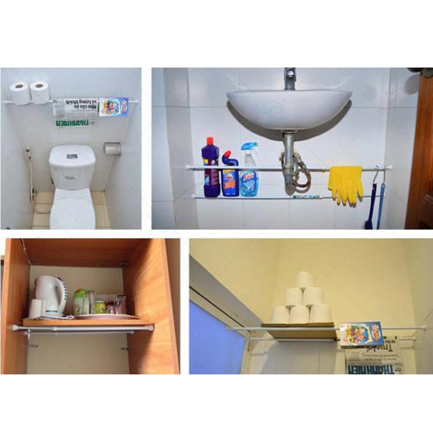 Thanh treo đa năng là giải pháp thông minh và tiện lợi, có thể treo được nhiều thứ mà không cần phải đóng đinh, khoan tường... sản phẩm được làm từ thép không gỉ, có khả năng chịu lực cao; bên ngoài được phủ một lớp sơn tĩnh điện chống gỉ sét cao cấp. Bạn có thể thoải mái lặp đặt nó tại phòng vệ sinh hay nhà tắm mà không sợ nó sẽ bị gỉ sét như những sản phẩm thanh treo kim loại trước đây.Thanh treo có thể dễ dàng điều chỉnh độ dài ngắn để thay đổi vị trí lắp đặt hay cất gọn đi một cách dễ dàng. Phần đầu của thanh treo được làm từ cao su để tăng độ bám dính. Kết hợp với nó là lò xo ở bên trong có nhiệm vụ tăng cường lực đẩy, giúp cho thanh treo có khả năng chịu lực tốt hơn.