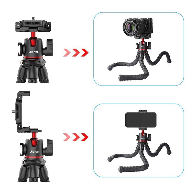 Ulanzi MT-33 là tripod bạch tuộc phiên bản mở rộng từ Ulanzi MT-11 với nhiều thiết kế bổ sung như có thêm cold shoe giúp gắn thêm micro ngoài, đèn led trợ sáng hỗ trợ quá trình quay video tốt hơn. Ulanzi có thể sử dụng đồng thời cho cả máy ảnh và điện thoại mà không cần mua thêm gá kẹp.