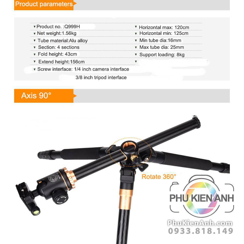 Tripod Beike Q999H có trục trượt ngang để chụp sản phẩm, quay phim, có mono tripod.Sản phẩm Thông Số Kỹ Thuật:
