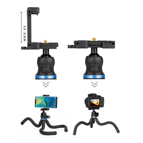 Ball head tích hợp sẵn kẹp điện thoại, giọt nước giúp cân bằng.Có ballhead gắn máy ảnh ,tải trọng tối đa 2kg