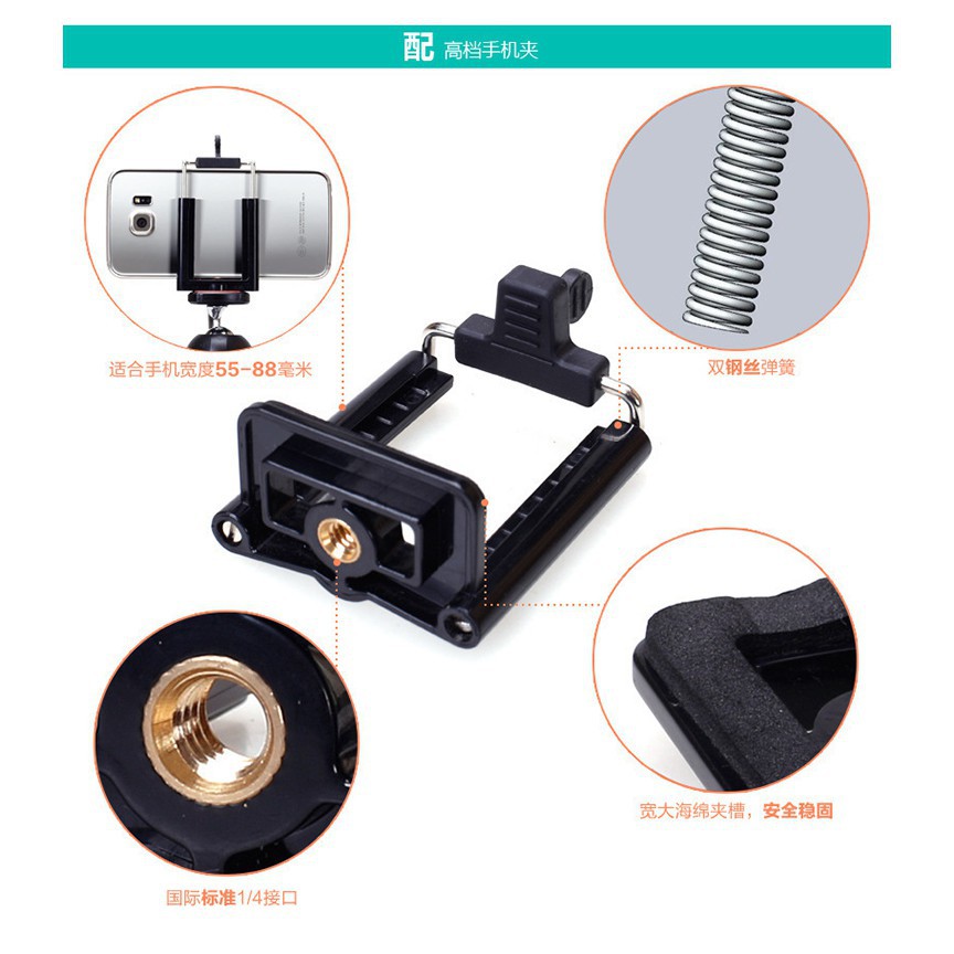 Đi kèm còn có một chiếc gá kẹp điện thoại có độ rộng gá kẹp có thể thay đổi từ 53mm đến 80mm để bạn có thể gắn điện thoại lên.