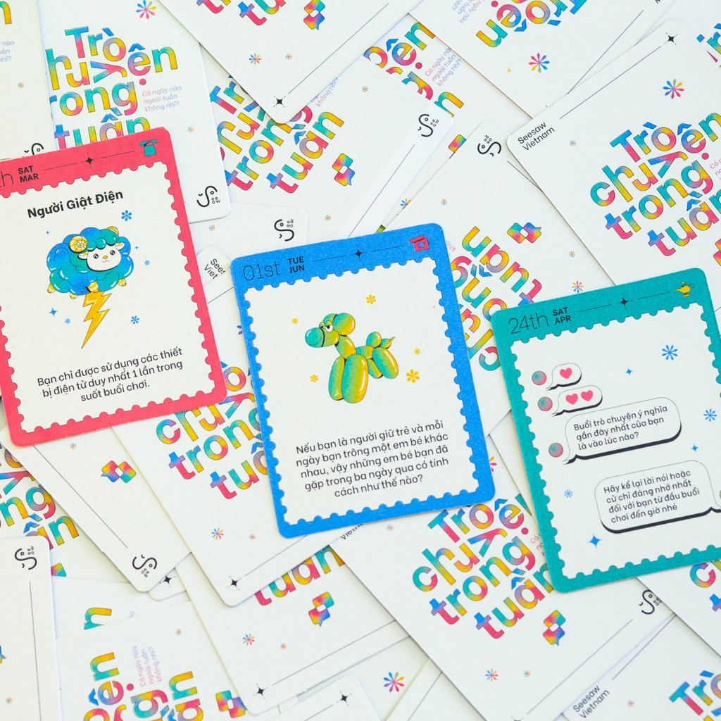 "Trò Chuyện Trong Tuần" là một bộ trò chơi chia sẻ và nhập vai, giúp người chơi có thể chia sẻ các cảm xúc, sự kiện diễn ra trong tuần một cách tự nhiên, vui vẻ và thú vị từ đó mang lại ý tưởng mới cho cuộc trò chuyện mỗi tuần và gắn kết người chơi một cách sâu sắc với những mối quan hệ xung quanh và chính bản thân mình! Bộ bài rất lý tưởng để chơi cùng bạn bè, người thân, người yêu và để làm quà tặng 💝"Trò Chuyện Trong Tuần" có gì?