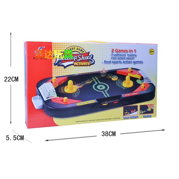 Trò chơi khúc côn cầu trên băng . Bộ có thể lắp ráp trong vài phút và bao gồm 2 mỗi xe đẩy, pucks Quả bóng đá cùng với 2 lưới cho gõ khúc côn cầu trò chơi và 2 khay vào đó bóng đá bóng thả khi một mục tiêu là ghi bàn.