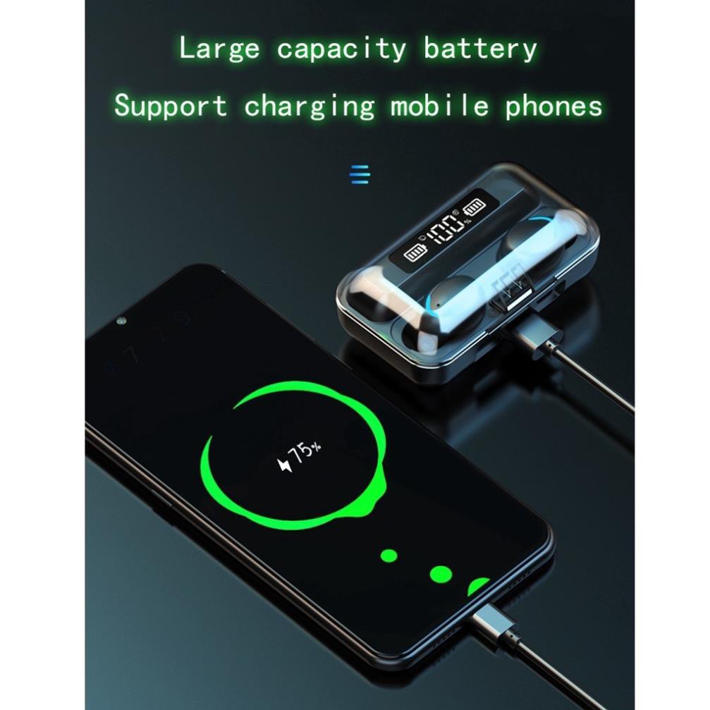 Hộp sạc có dung lượng pin lên đến 2000mAh. Dung lượng pin từ dock sạc có thể giúp tai nghe F9, nghe nhạc đến 280 giờ (khoảng 15 ngày) và 300 giờ đàm thoại. Ngoài ra, sản phẩm còn hỗ trợ sạc pin cho điện thoại, làm việc hiệu quả như một thiết bị sạc dự phòng.