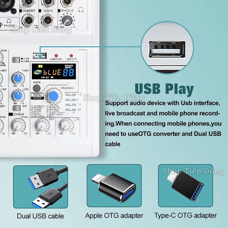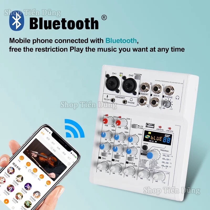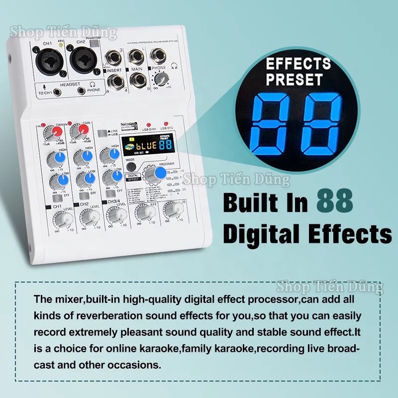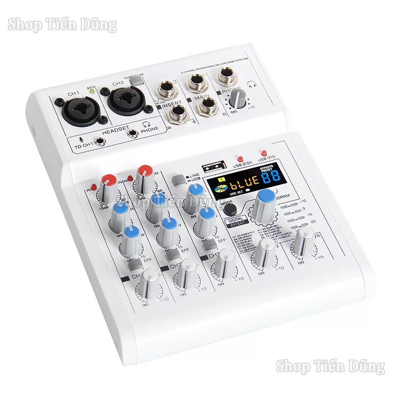 Bộ Trộn Âm Thanh Mixer E4 Có Bluetooth 4 kênh 88 88 hiệu ứng DSP Hỗ Trợ Nguồn 48v có thể Livestream, karaoke , ghi âm Trong Gia Đình, Ngoài Trời.✔️ LƯU Ý : Sản phẩm có thể thay đổi vỏ hộp và màu sắc theo nhà sản xuất.