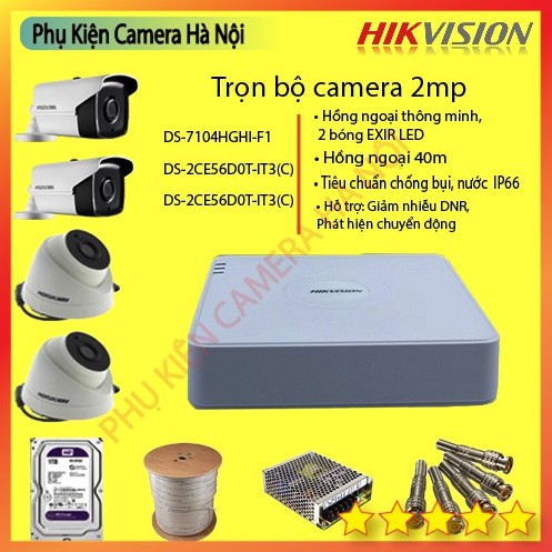 Trọn bộ Camera Hikvision DS-2CE56D0T-IT3 FULL HD 1080P - Hàng chính hãng, bảo hành 24 tháng, đầy đủ phụ kiện bao gồm: