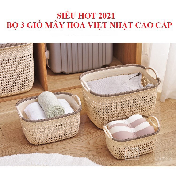 Trọn bộ 3 rổ nhựa Việt Nhật có quai cao cấp - Combo 3 giỏ nhựa giả mây Việt Nhật