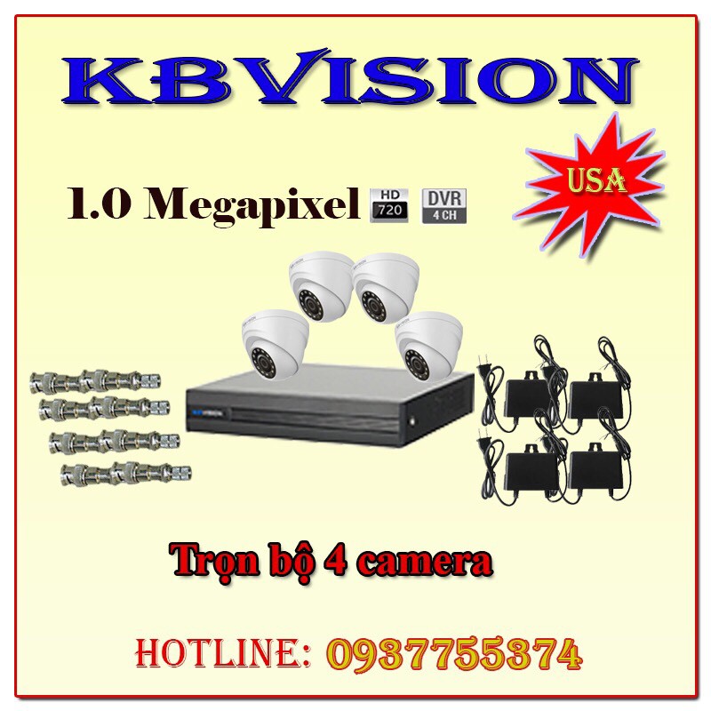 Trọn bộ 4 camera KBVISION HD siêu nét thích hợp lắp cho gia đình, văn phòng, nhà xưỡng, shopping....Trọn bộ bao gồm :