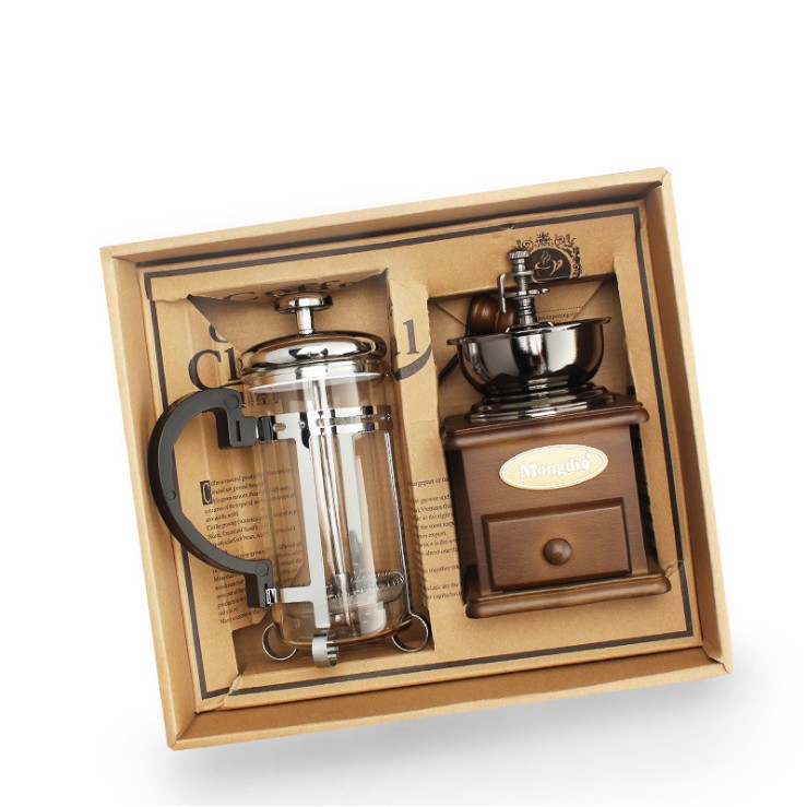- Chất liệu của dung cụ xay cà phê : Gỗ + kim loại