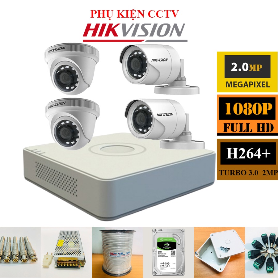Trọn Bộ Camera 4 Mắt Hikvision Chính Hãng 2Mp Full HD 1080P (FULL PHỤ KIỆN LẮP ĐẶT), Ổ Cứng tùy chọn