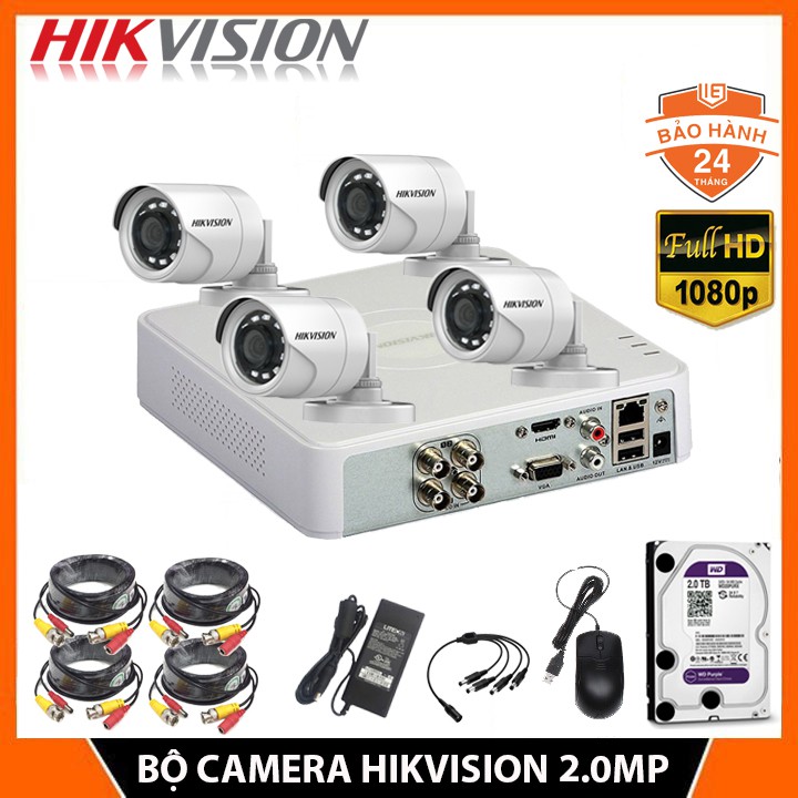 Trọn Bộ camera giám sát Hikvision 2.0MP-FHD 1080P - Đủ bộ 4 mắt 2.0MP- đầy đủ phụ kiện Lắp đặt