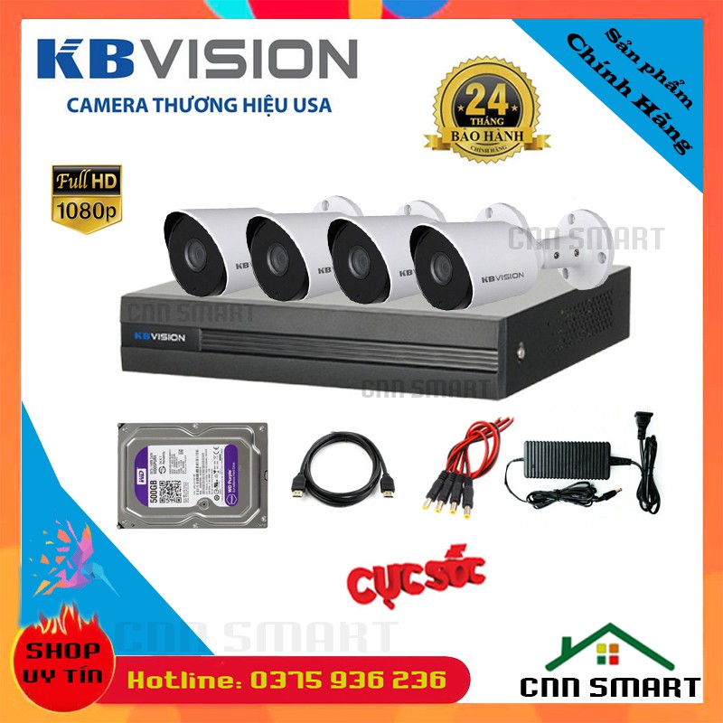 Trọn bộ Camera Giám sát KBVISION FullHD 2M 1080, hồng ngoại 20m, đầy đủ phụ kiện-[ 2100cb4 2112cb4]-Chính Hãng KB VISION