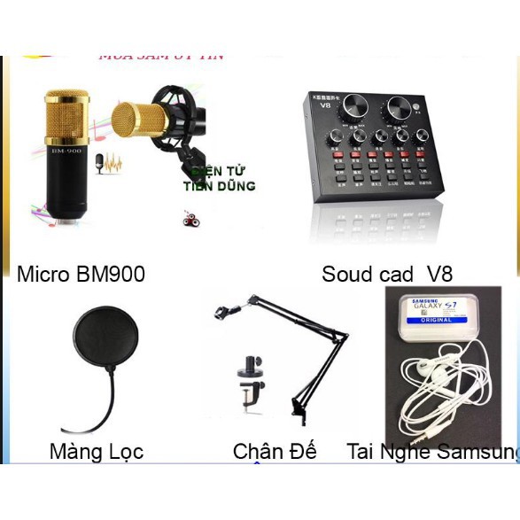 Trọn Bộ Combo Micro bm900 + Soundcard V8 + màng lọc,kẹp bàn , tặng tai nghe