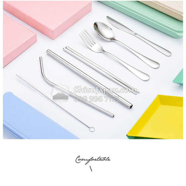 🎀Một bộ gồm 9 món: Túi vải đệm dày, hộp đựng, muỗng, đũa, nĩa, dao, ống hút cong, ống hút trân châu và cọ rửa ống hút.