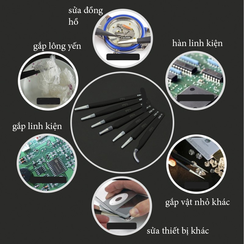 Sản phẩm gồm: 1 nhíp cong, 1 nhíp thẳng, 1 cây nạy, 1 bộ tua Vít