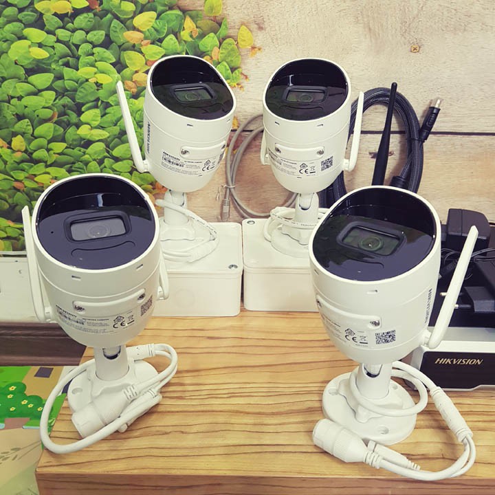 Trọn bộ camera 4 mắt Wifi Hikvision camera kết nối wifi dùng đầu ghi mới nhất của HIKVISION phát wifi mạnh Gấp 4 lần so với bộ cũ mà giá thành lại rẻ hơn bộ cũ, chất lượng camera được nâng cấp lên đáng kể.Trọn bộ 4 Camera IP Wifi Hikvision NK42W0H(D) ngoài trời, camera 2 râu, đầu ghi phát wifi xuyên tường