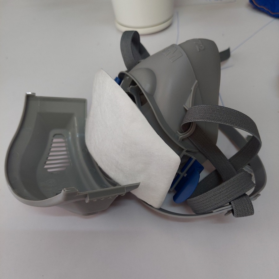 2️⃣Đặt tấm lọc 3M 7744 vào, chú ý để mặt được in hướng về phía khuôn mặt.