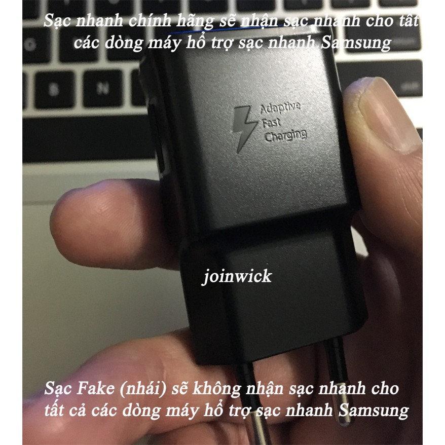 + Đối với sạc nhanh chính hãng, bạn cắm vô tất cả các dòng máy hổ trợ sạc nhanh thì phải nhận sạc nhanh. Còn sạc Fake (nhái) chỉ nhận sạc nhanh trên các dòng máy phổ biết như S10/S10 Plus/S9/S9 Plus/S8/S8 Plus/S7/S7 Edge/S6/Note 5, sạc Fake (nhái) khi cắm vào các dòng máy hổ trợ sạc nhanh khác như A9 Pro, C9, A5 2017, A7 2017, A5 2016, A7 2016 sẽ không nhận sạc nhanh.Cách khác các bạn lấy cục sạc nhanh cắm vào đế sạc không dây của.