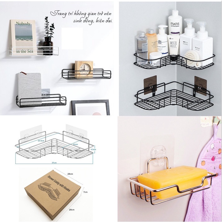 Trọn Bộ Sản Phẩm Kệ Góc Nhà Tắm Kệ Inox 304, Kệ Chữ Nhật Dán Tường, Giá Để Xà Bông (Hàng Loai 1 - SP Đã Gồm Miếng Dán)