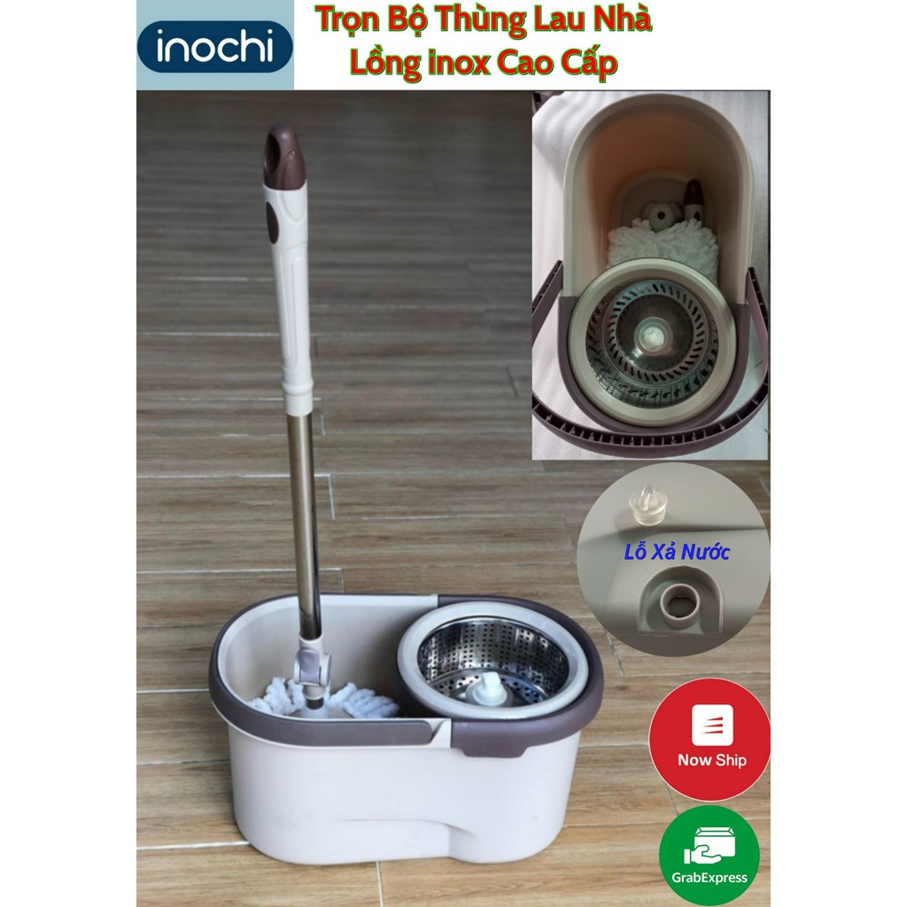 TRỌN BỘ THÙNG LAU NHÀ CAO CẤP INOCHI( THÙNG LAU LỒNG INOX + CÂY LAU NHÀ + 2 BÔNG LAU )