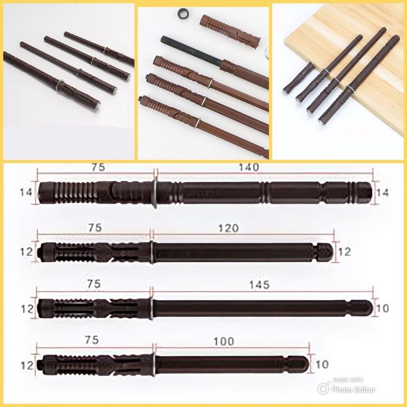 Ứng dụng: Đầu chốt gồm bulông và nở khoan bắt trực tiếp vào tường, đầu lục giác bắt vào lỗ khoan đỡ kệ.