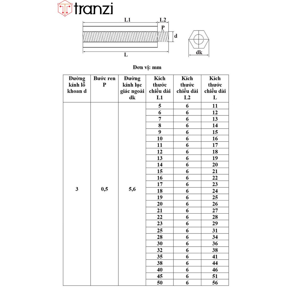 Thông số kỹ thuật của Trụ vít lục giác đực cái nhựa trắng M3x5+6: