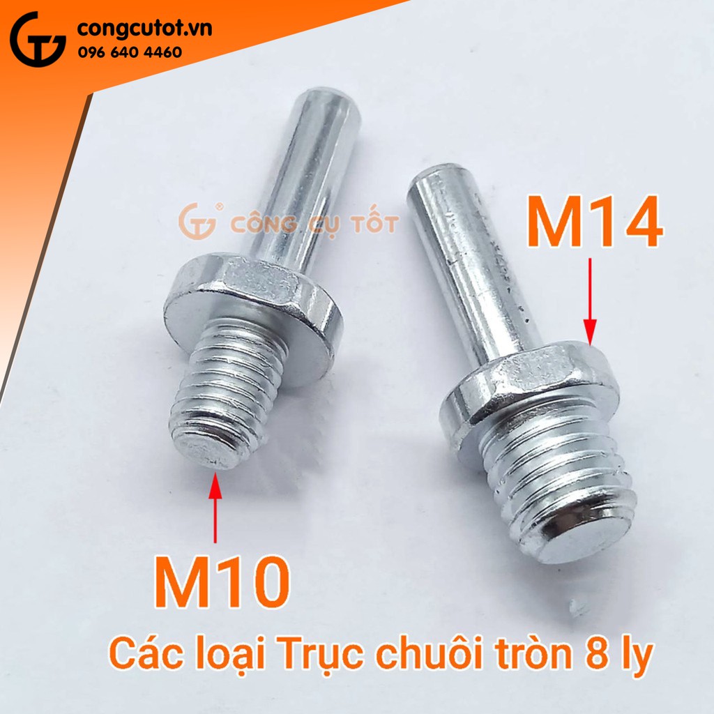 Trục chuôi tròn 8 ly là phụ kiện hữu ích giúp kết nối đế chà nhám tròn vào máy cắt một cách chắc chắn và nhanh chóng.có 2 loại: nối ren m10 và nối ren m14