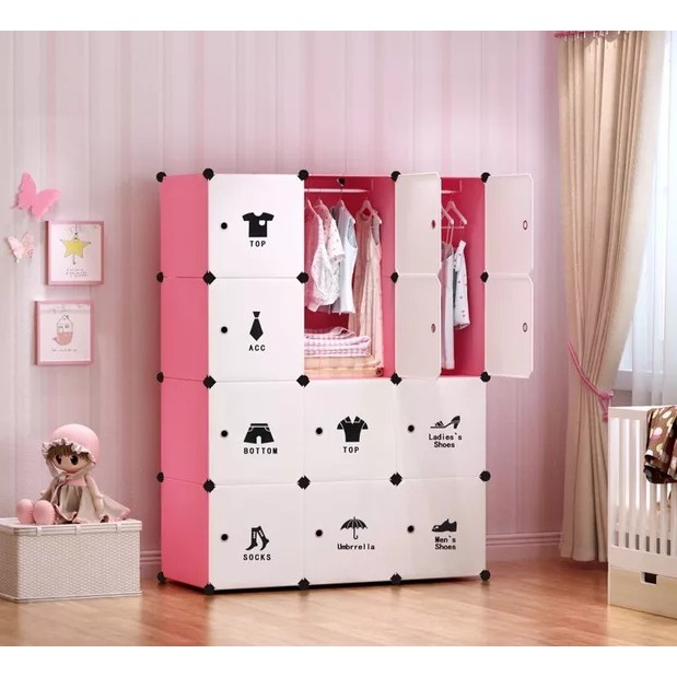 Cửa tủ trắng có icon, thân tủ có thể chọn: hồng, xanh dương, vàng, đỏ, tím