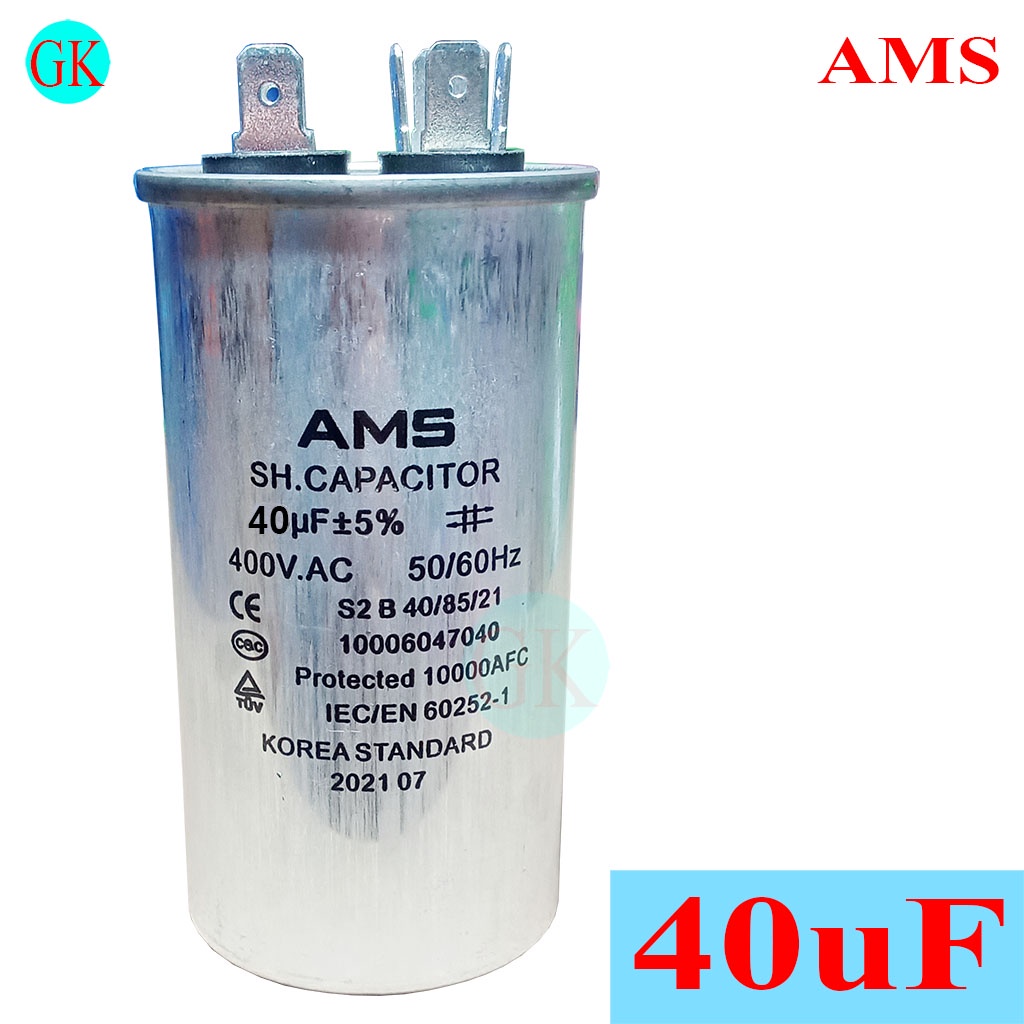 Giới thiệu Tụ 40uF 400Vac, vỏ nhôm, chân cắm, thương hiệu AMS