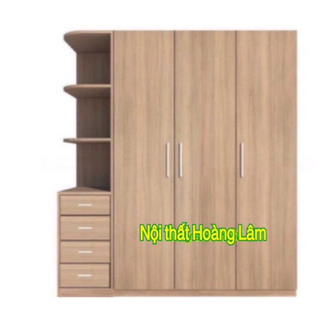Tủ được thiết kế tiện dụng với 3 cánh kết hợp với 2 ngăn kéo to tiện dụng và giá trang trí bên cạnh để đồ có thể chứa được khối lượng quần áo lớn.
