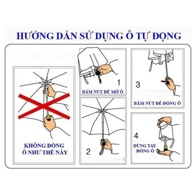 - An toàn, lưu ý: khi sử dụng dùng 1 tay bấm mở ra và bấm cụp vào, **tuyệt đối không dùng tay kéo ô cụp xuống sẽ ảnh hưởng chức năng tự cụp!** và shop đã ấn vài lần kiểm tra truoc khi đóng gói!