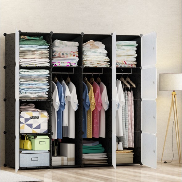 Gồm tất cả 16 ngăn tủ: 12 ngăn tủ lớn vừa gấp vừa treo đồ, 4 ngăn tủ xéo có thể trang trí đồ lưu niệm hoặc túi xách...