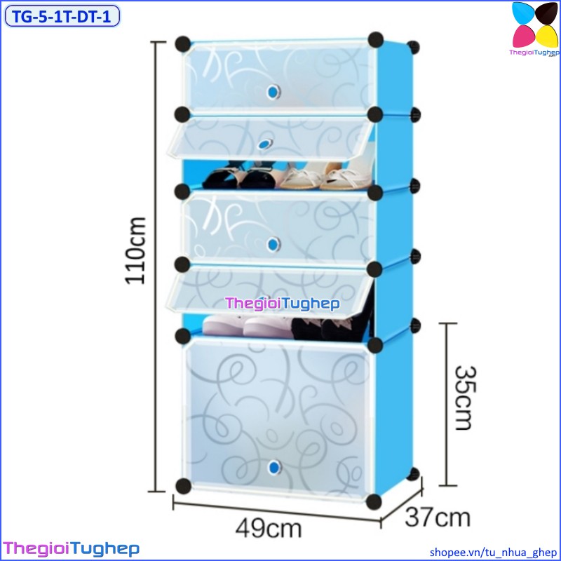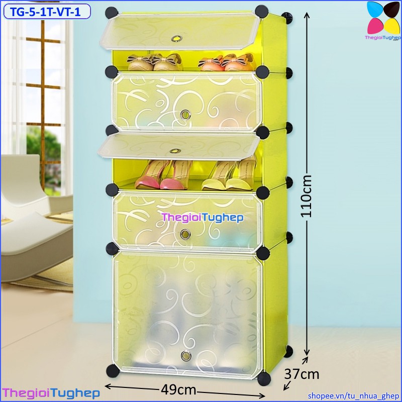 Tủ giầy nhựa lắp ghép 5 ô, có cửa, 5 tầng để được 10 đôi giày, có ô để bốt (Đen vân, Vàng trơn, Xanh dương, Hồng phấn)