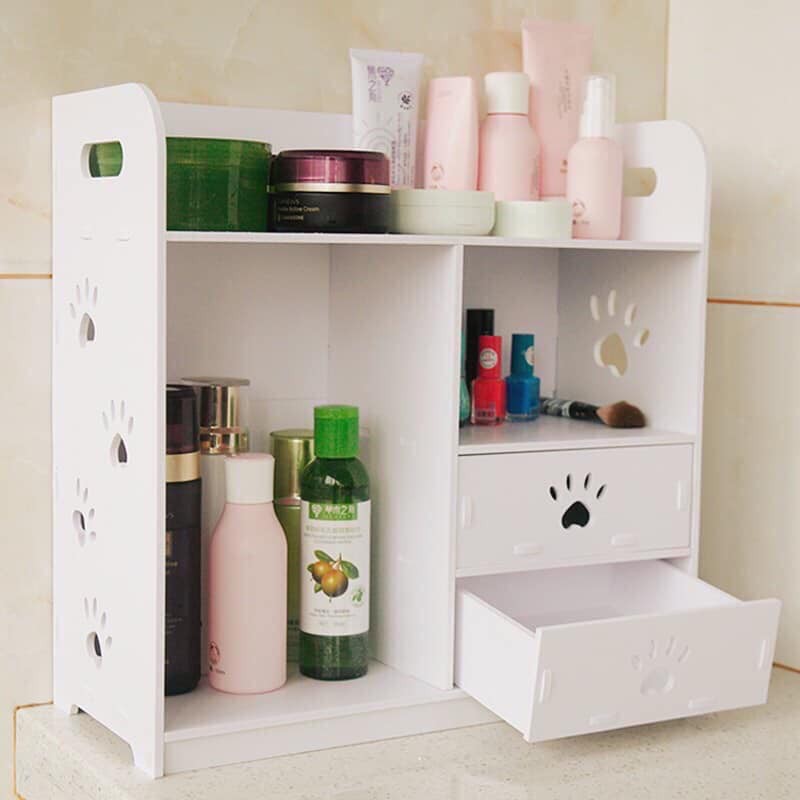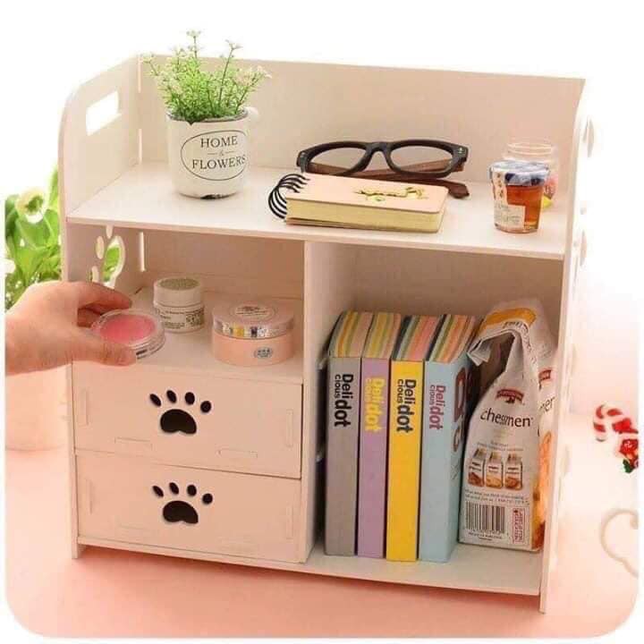 Kệ gỗ đựng đồ trang điểm có 2 ngăn kéo kiểu dáng siêu xinh, Kt nhỏ gọn 38x38x17cmKệ tủ rất tiện lợi có thể tháo rời khi không cần sử dụng, màu trắng trẻ trung