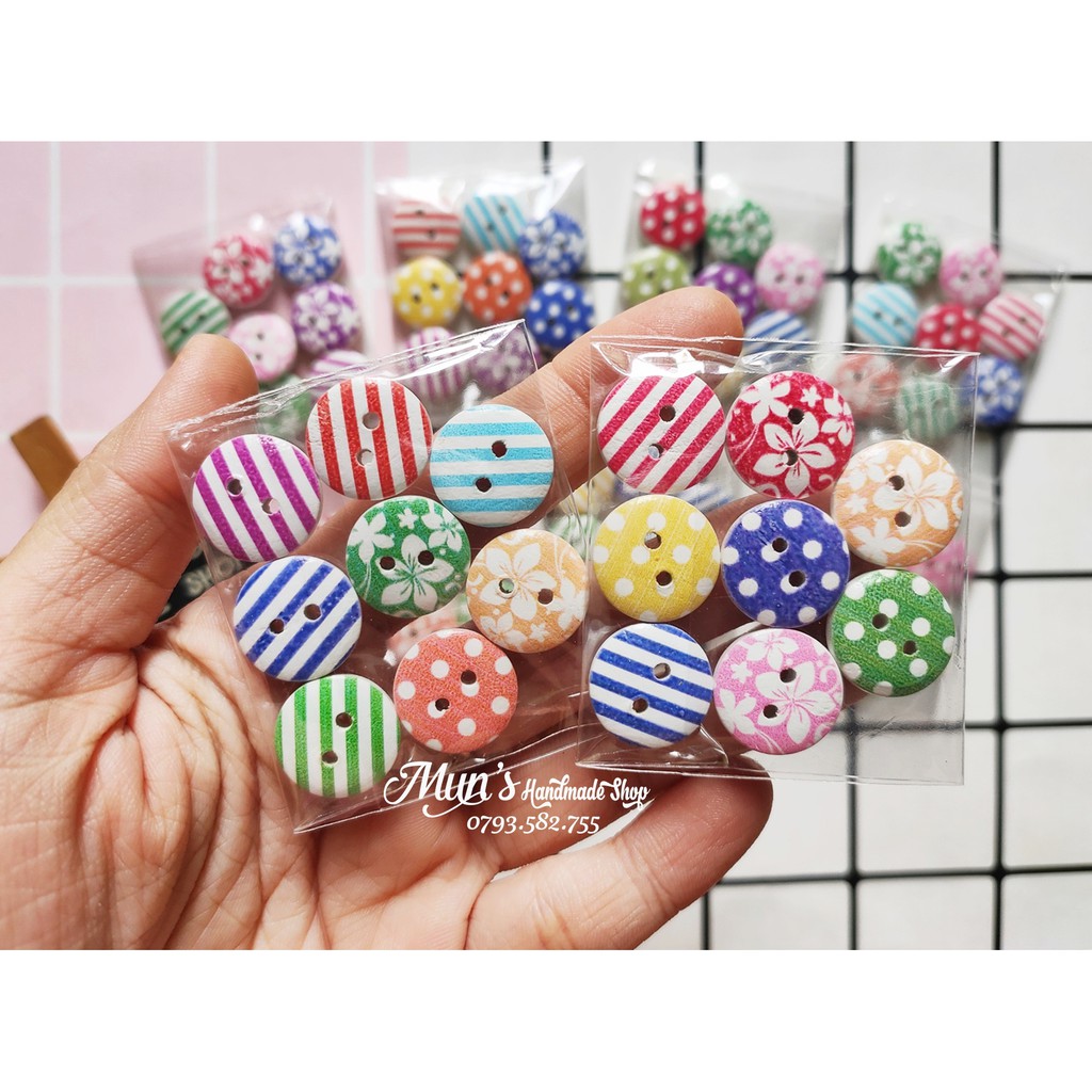 Túi 8 nút gỗ tròn họa tiết+ Kích thước: 1.5cm